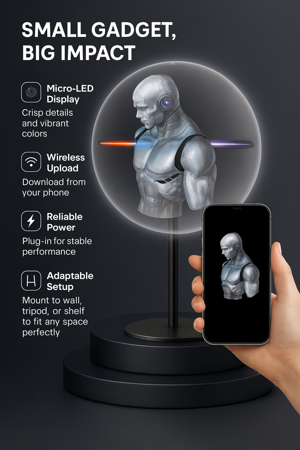 Activate the holographic display with a single tap and watch as your space transforms with mesmerizing visuals.