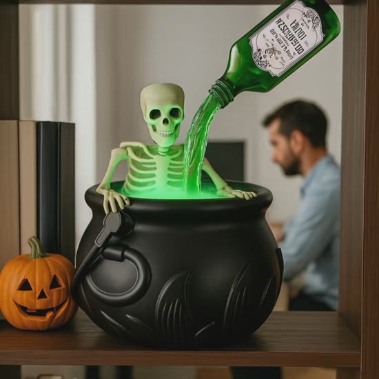 A potion bottle appears to float above your cauldron. Hidden stability tubes secure it while mist spills over edges—creating a spellbinding cauldron Halloween decor with eerie ambiance.